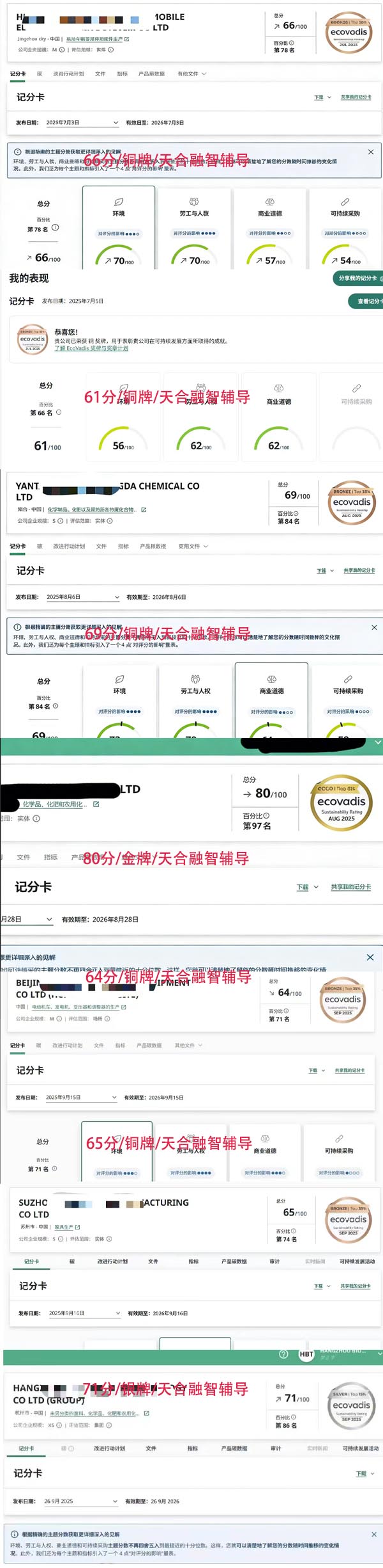 2025年7-9月EcoVadis认证服务高分案例展示