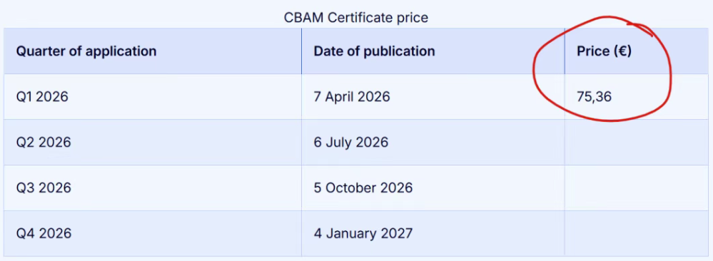 2026年是CBAM正式实施的首年,为了简化操作,CBAM证书的价格采用“季度均价”。也就是说,针对在2026年二季度进口的产品,欧委会还会再公布一个新的CBAM证书价格,以反映2026年二季度的欧盟碳市场的平均碳价。这个价格将在2026年7月6日公布。其后的三季度、四季度亦循此规律。