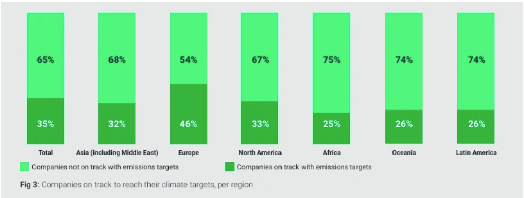 全球约35%的企业成功达成碳减排目标,其中欧洲占比最高(46%),其次是北美(33%)和亚洲(32%)。尽管全球碳排放总量仍在上升,但自2016年以来,持续披露信息的企业已实现Scope 1碳排放量每年降低2%。然而,为了实现《巴黎协定》1.5°C控温目标,企业仍需进一步减少Scope 2和Scope 3排放。未来,企业要达到2030年的减排目标,每年需减少7%的排放,而要实现2050年的目标,则需保持年均3%的降幅。