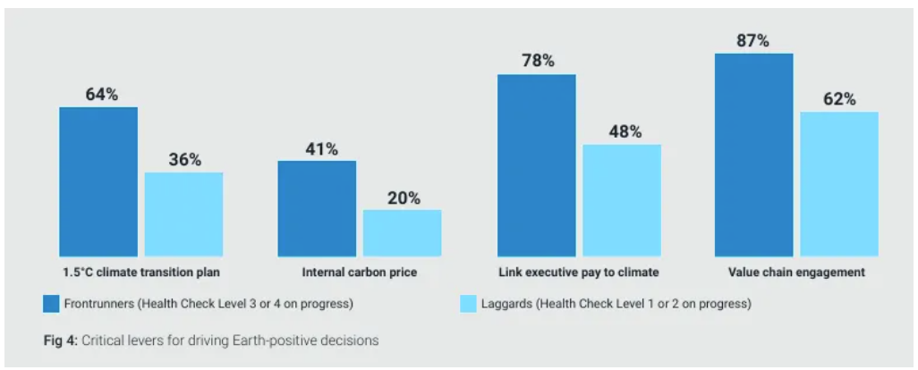 CDP对领先企业与落后企业进行对比分析后发现,将可持续发展纳入公司治理,并由董事会直接负责,能带来积极影响。制定清晰的转型战略、设定内部碳定价、将高管薪酬与气候目标挂钩,以及深度融入价值链,均能有效提升企业的可持续发展能力。